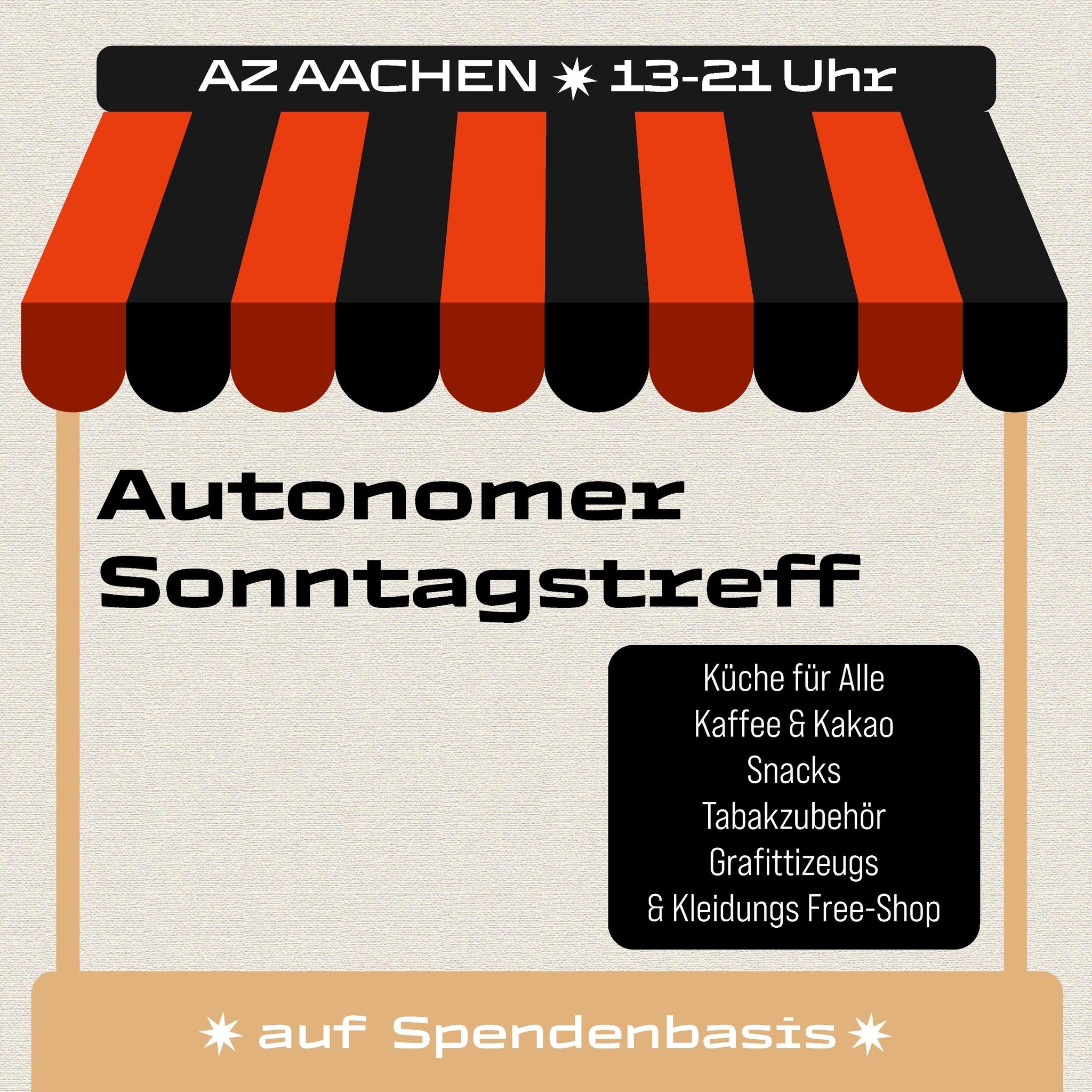 Erneut freuen wir uns euch am Sonntag (12.4.) herzlich zum Sonntagstreff von 13 bis 21 Uhr einzuladen! Auf Spendenbasis gibt es Essen, Kaffee & Kakao, Snacks, Tabakzubehör und Graffitizeug. Zusätzlich gibt es einen Free Shop für Kleidung, also bringt gerne Klamotten mit, die ihr nicht mehr tragt, aber andere Menschen noch gebrauchen können. Das Event soll eine Mischung aus Kiosk-Ersatz und Café darstellen und läd dazu ein, gemeinsam Zeit zu verbringen. Bis Sonntag, wir freuen uns!