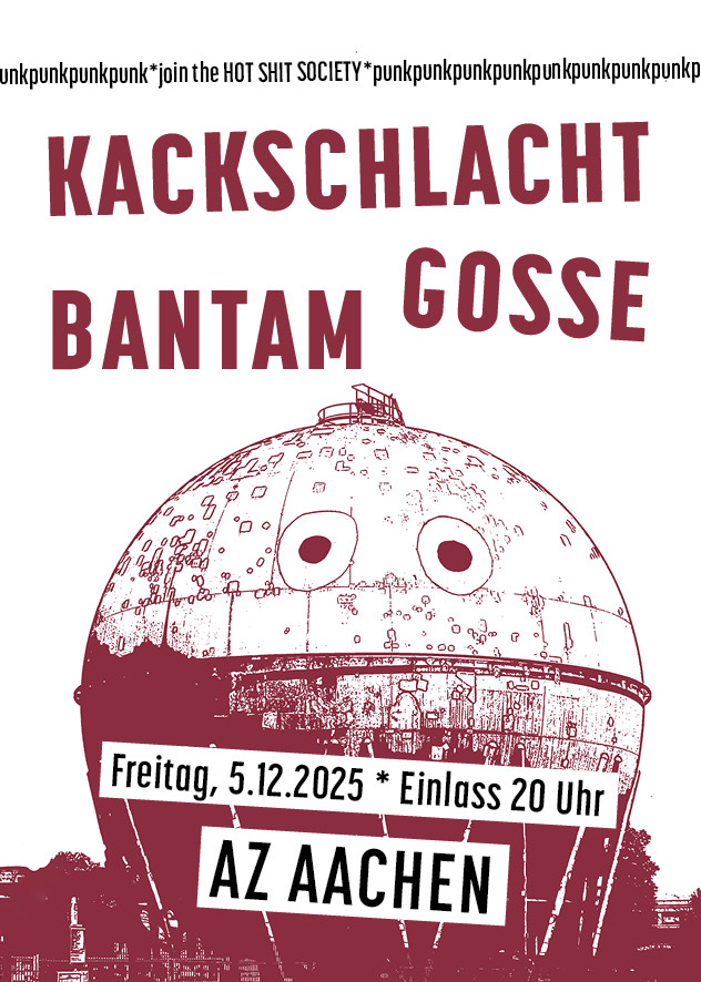 Lange sehnlichst erwartet im AZ Aachen: Kackschlacht ist die Essenz des Deutschpunks im Kleinformat. Die 2personenkapelle aus Braunschweig rumpelt und krächzt sich durch die wichtigsten Themen des Lebens und wir glauben jedes Wort.