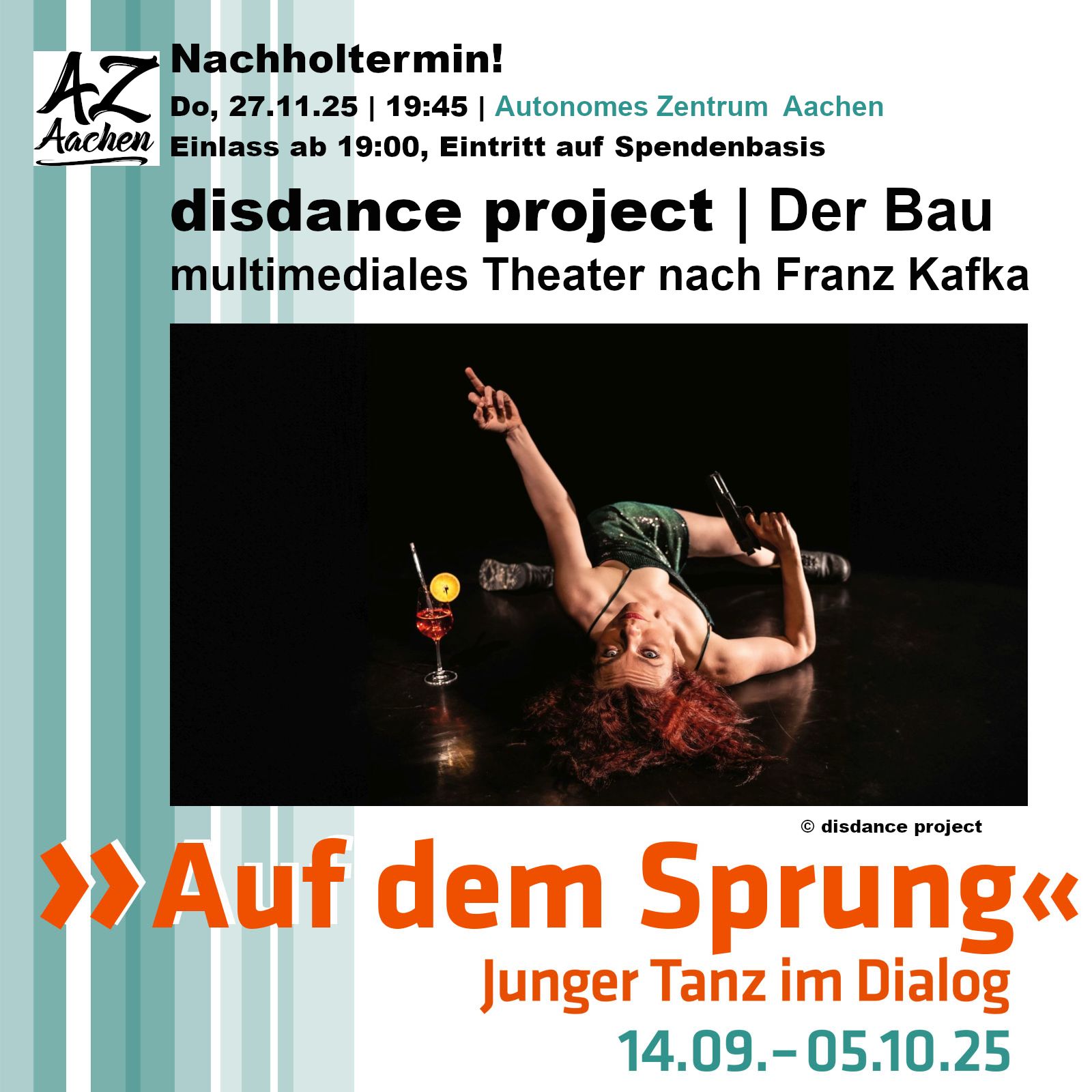 Die Erzählung schildert den vergeblichen Kampf um die Perfektionierung eines riesigen Erdbaues zum Schutz vor Feinden. disdance project inszeniert Kafkas Fragment interaktiv und multimedial und bringt die Publikumsbeteiligung auf ein neues Level. Der Text entsteht dynamisch in jeder Aufführung neu – unter Zuhilfenahme KI generierter emotionaler Stimmmodelle. Ist das Kafka? Oder mein Nachbar? Ist das live oder haben das Algorithmen vorausgesehen? Bin ich sicher?